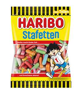 Soft licorice sticks in a crunchy candy shell. Haribo relay races are colorful, sugar-coated licorice sticks with a deliciously soft and aromatic center. The candy shell comes in various colors and flavor variations such as orange, lemon, pineapple, strawberry and raspberry. A must for every lover of candied licorice.